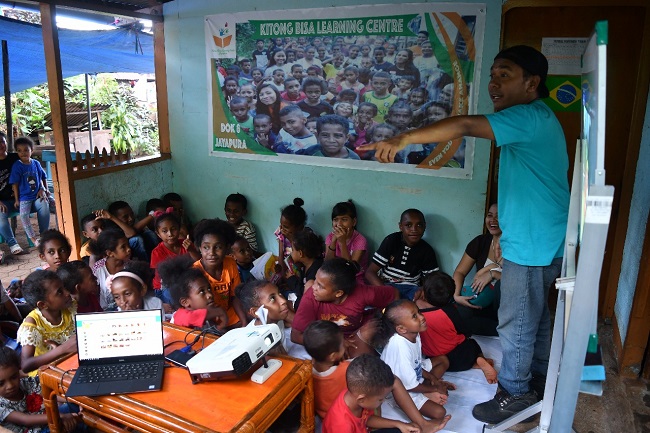 Billy teaching English to children in Papua at Kitong Bisa / Billy Mambrasar