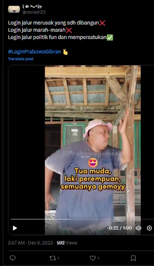 For instance, after the first debate on 12 December 2023 – in which Prabowo performed poorly and seemed unprepared to counter criticism from his rivals, breaking out in a nervous dance (his campaign trademark) whenever he felt cornered – numerous tweets suddenly appeared stating ‘Our Prabowo, our choice’, paired with the hashtag #KitaMudaBeraniKeren, ‘we are young, daring and cool’, and the line ‘such fun with father Bowo and Gibran’ (SerunyaBareng AyahbowoGibran). In similar wording, each of these posts praised Prabowo as a true statesman who will work sincerely for the people’s welfare.